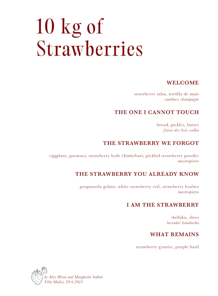 Since the age of fourteen, Margherita has lived with a rare and severe allergy to all fruits and vegetables. Her first anaphylactic shock was triggered by a strawberry ice cream. Unable to eat the fruit, she became intensely preoccupied with it. What began as a bodily prohibition turned into sustained curiosity: how strawberries are cultivated, how they smell, where their flavour comes from, and how they circulate through culture, industry, and imagination.