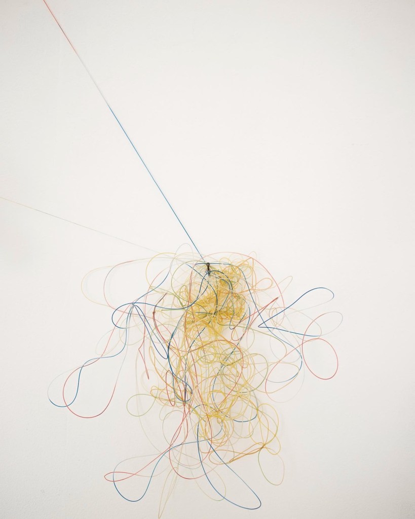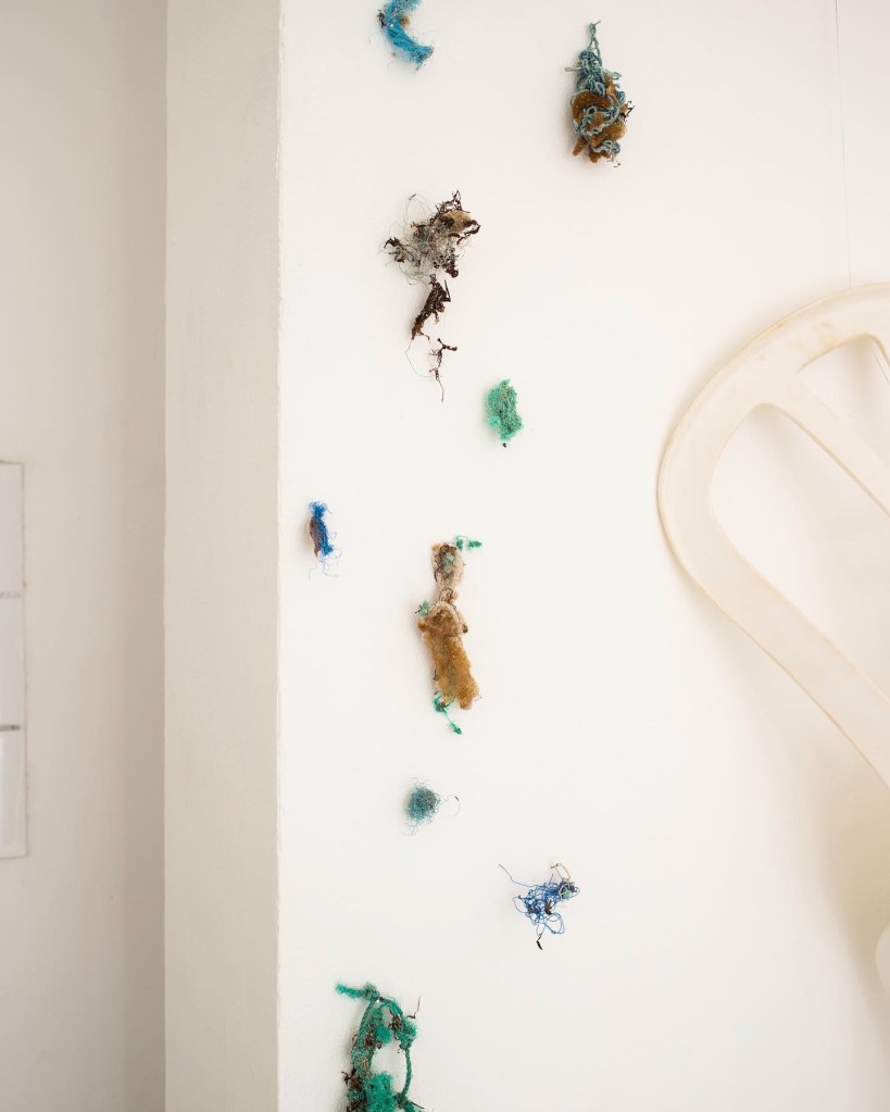 Instead of a thread, plastic fishing lines were used after being found entangled with algae and other organisms in the surrounding nature: in the sea and on the sand.